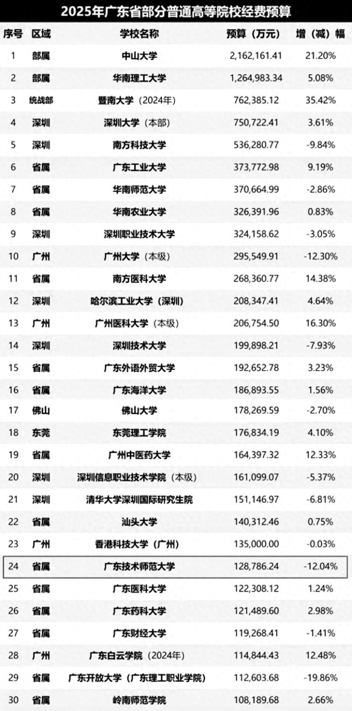 由于经济发达,人口基数庞大,广东省对高等教育发展的投入力度也很大,有很多报考价值高的大学,下面是广东省高校2025年经费预算排名情况:
